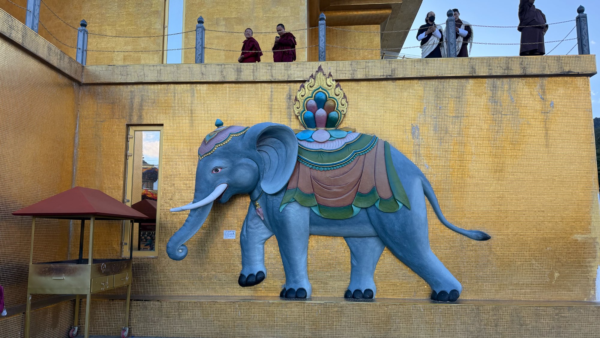 Impressionen der Buddha Dordenma Statue: Die gigantische sitzende Statue in der Seitenansicht, rituelle Aufbauten mit traditionellen Fadenkreuzen (Namkha/Mdos) auf dem Vorplatz, der Blick hinauf zum Gesicht des Buddha, das Relief eines blauen Elefanten am goldenen Sockel und die Aussicht über den Platz mit den goldenen Dakini-Statuen.