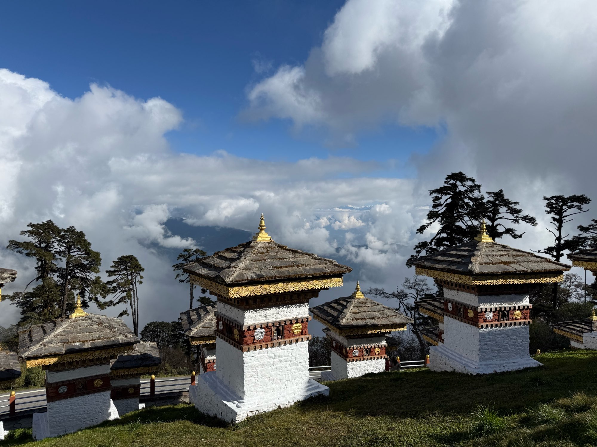 On the fourth day, we left the capital heading towards Punakha. The road led us over the Dochu La, a pass at an altitude of about 3,100 meters. Although a few clouds obscured the view of the very big ice giants of the Himalayas, gaps opened up again and again, through which we could see the snow-covered peaks.