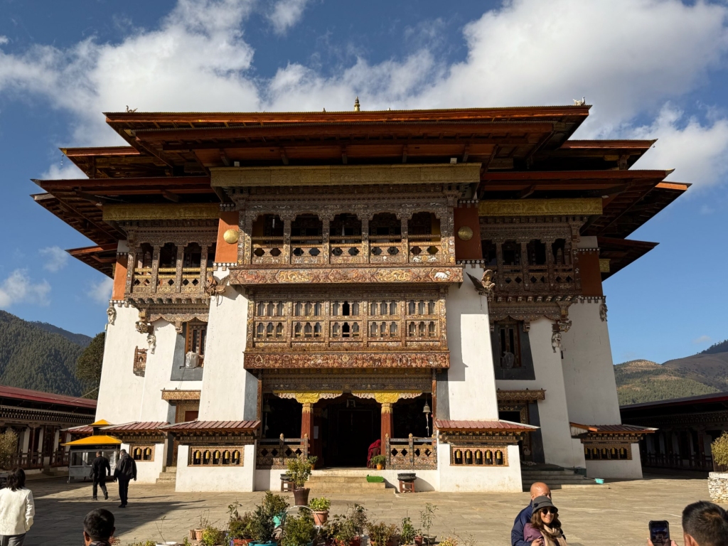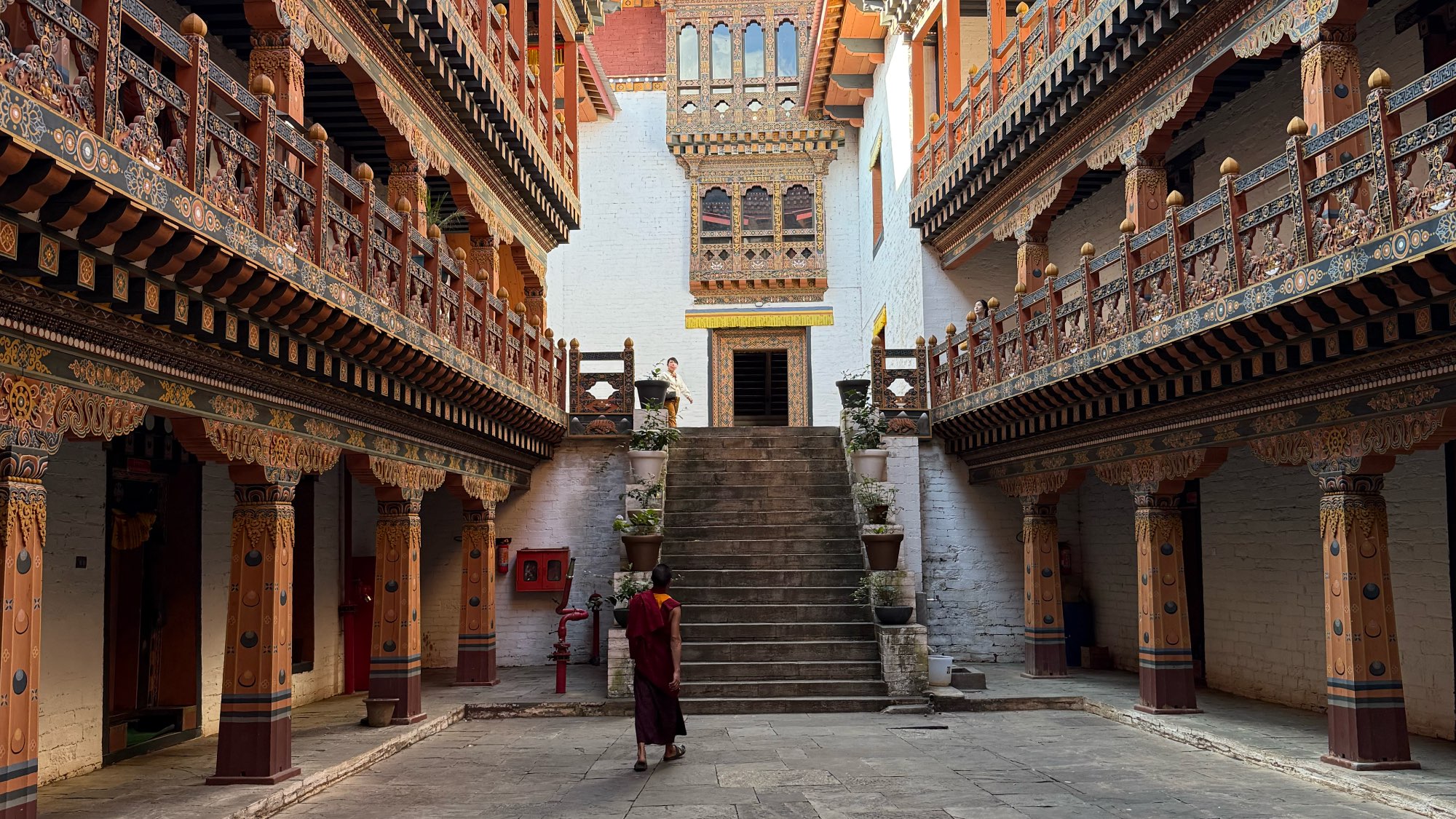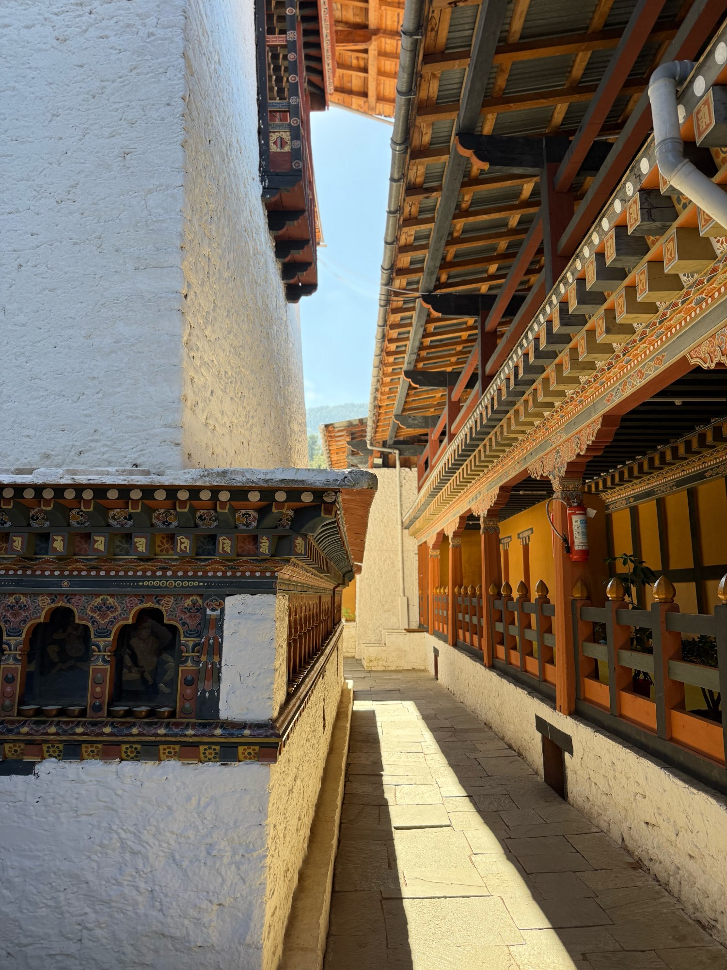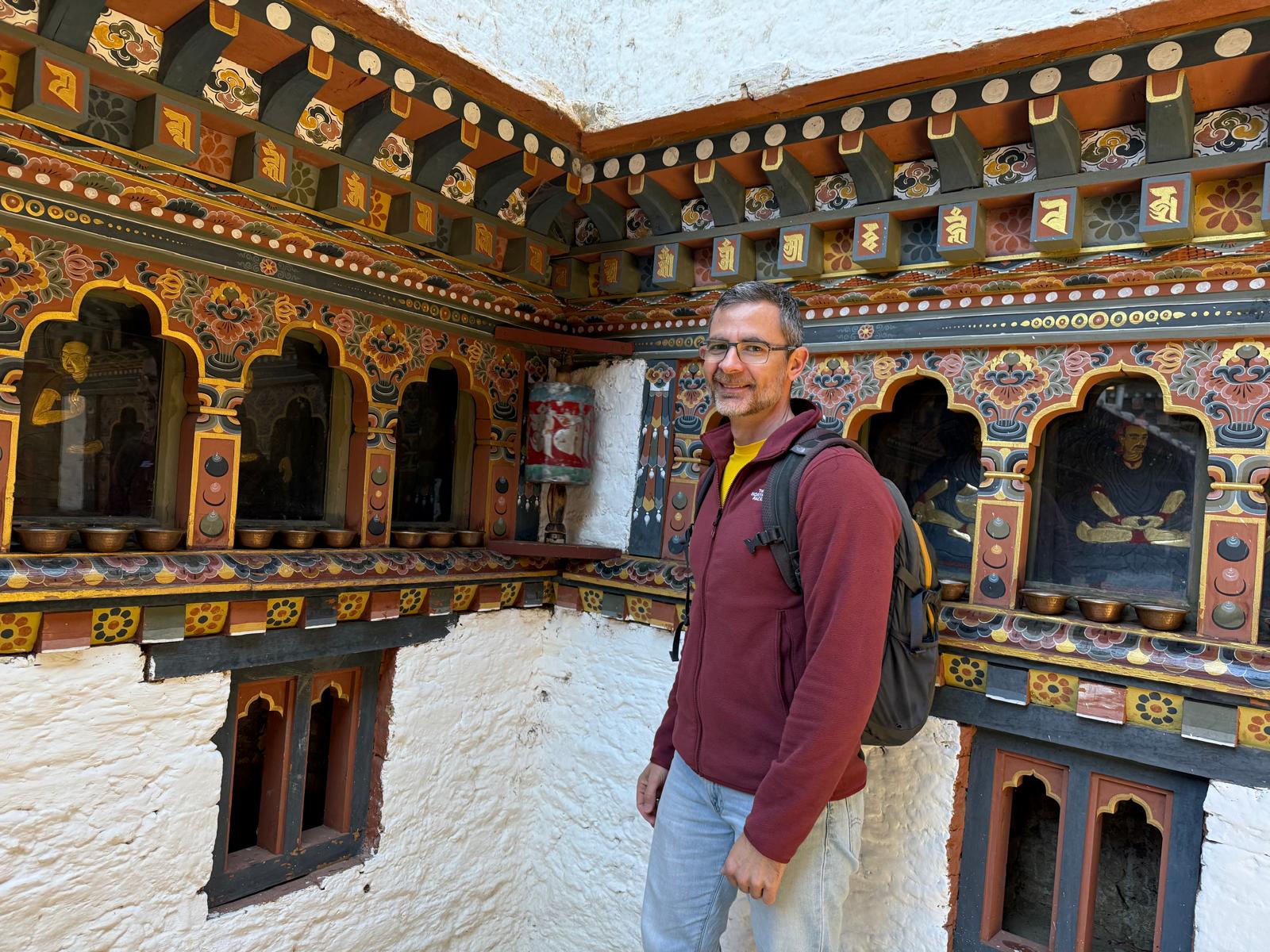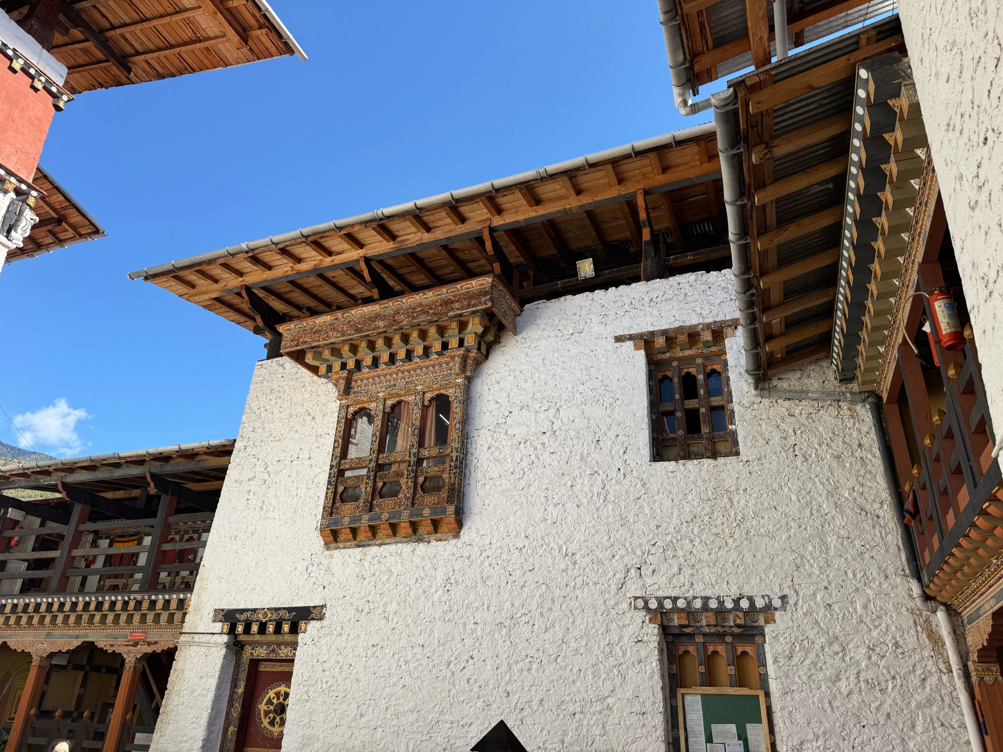 Architecturally, it is fascinating. At first glance, it looks like a Dzong, meaning one of the mighty fortresses we had seen before. But if you look closely, you notice a crucial difference. The military elements are missing. There are no arrow slits and no defensive walls. It was designed purely as a place of peace and practice. I was particularly impressed by the elaborate wood carvings visible everywhere, testifying to the high level of craftsmanship.