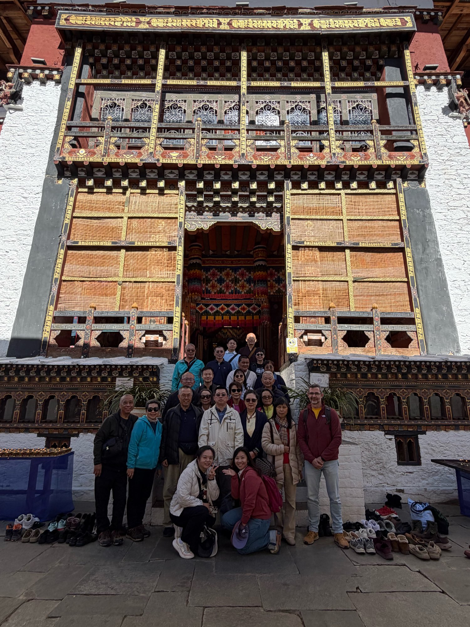 Impressions (in order): Intricate carvings at the portal, colorful wall murals of guardian deities, the spacious courtyard, a monk at the staircase, and our group photo in front of the Dzong.