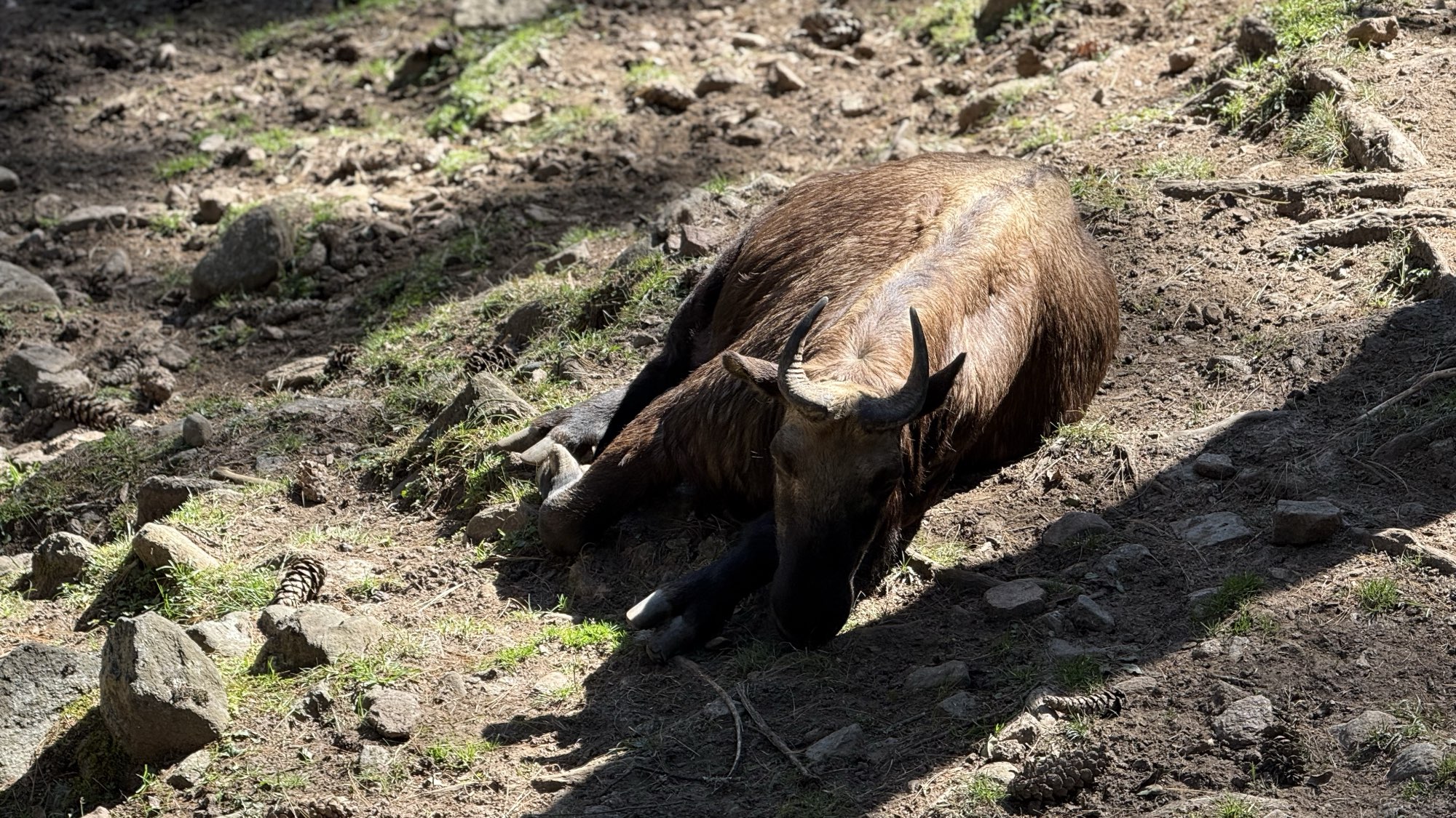 Impressions (in order): The spacious forest area of the preserve, a resting Takin in the shade, and an animal by the stream.